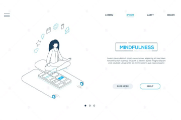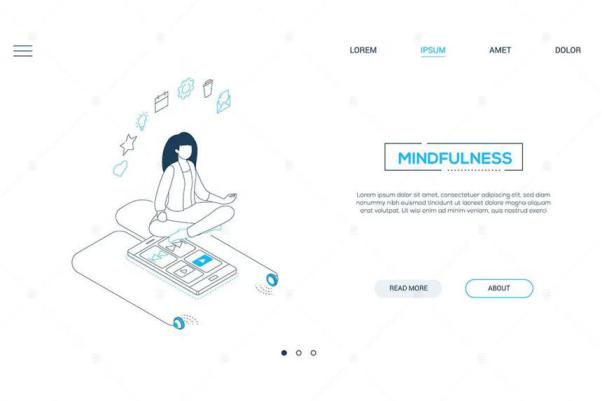 冥想主题线性设计风格矢量插画v1。一位女士在手机上冥想莲花姿势,智能手机和耳机。工作中的冥想概念。下载中包括可编辑的EPS10矢量和高品质的JPG文件。请注意,该文本不可编辑。