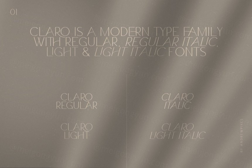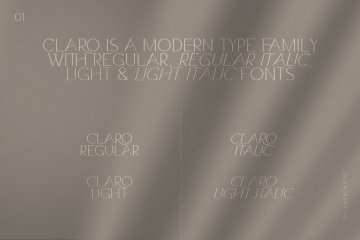 Claro 是一个 4 字体的现代无衬线字体系列,具有简洁的线条和大量的连字和交替。 它由 Claro Regular、Claro Italic、Claro Light 和 Claro Light Italic 组成。