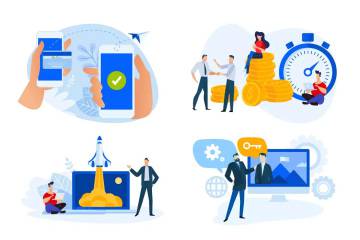 金融市场主题扁平设计风格的矢量插画,包括电子银行汇款、时间就是金钱、产品和服务推出、大客户管理主题。 网站横幅,营销材料,业务演示,在线广告的矢量概念插画。Zip中包括eps、jpg文件。
