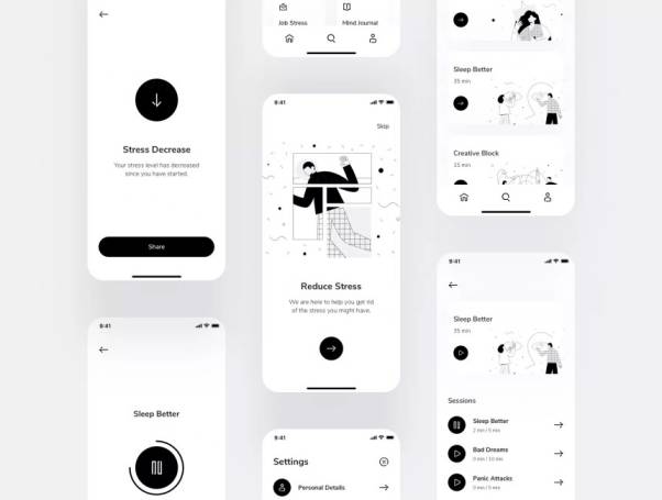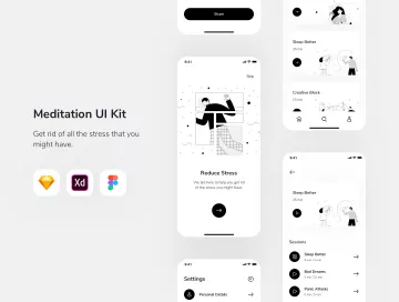 冥想APP应用程序UI套件,总共包含15个屏幕。与Sketch,Adobe XD和Figma兼容。请注意,此APP应用设计套件中使用的插画源文件不包括在内,这意味着您只能通过此UI工具包获得插画的“ PNG”版本。
