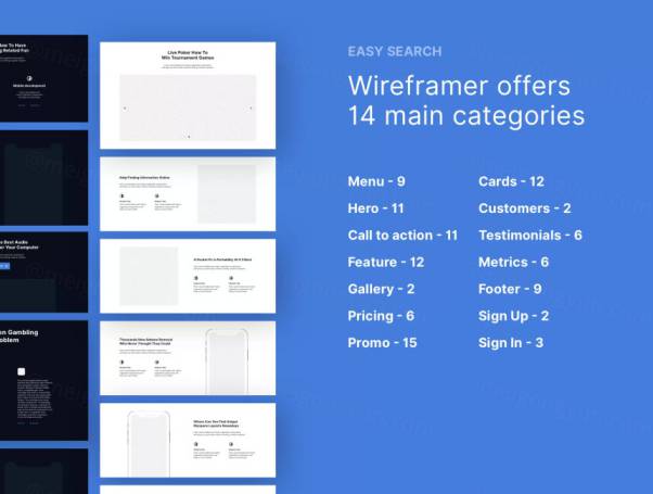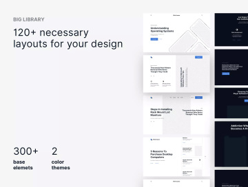使用这款网站线框图模板,您可以无限地创建设计。包括14个主要类别中的120多个布局,2个颜色主题(浅色和深色),300多个基本元素。完全可定制的组件将帮助您更快地工作。