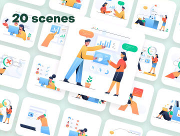 这是一个高质量且可自定义矢量插画库。与插画匹配的主题是数据分析和搜索、在线营销、团队发展、社交媒体、项目启动、发展社交网络。对于设计师,开发人员,初创公司和设计机构加快设计过程非常有用。非常适合网站和移动UI应用程序以及有用的场景创建器。