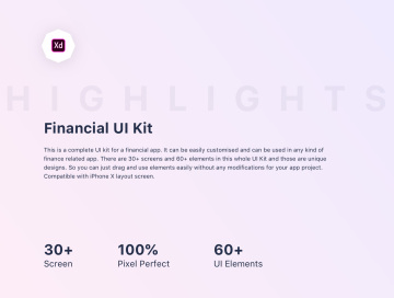 这是金融APP应用程序的完整UI工具包。它可以轻松自定义,并且可以在任何与财务相关的应用中使用。整个UI套件中有30多个屏幕和60多个元素,这些都是独特的设计。因此,您可以轻松拖动和使用元素,而无需对您的财务APP应用程序项目进行任何修改。