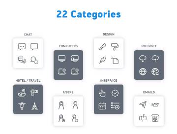 类别为:箭头、聊天、服装、电脑/技术、内容、设计、开发、电子邮件、文件/文件夹、食品/饮料/厨房、家具/灯、酒店/旅行、接口、互联网、医疗、电话/手机、照片/音乐/视频、购物/金钱、表情、体育/健身、用户、天气。