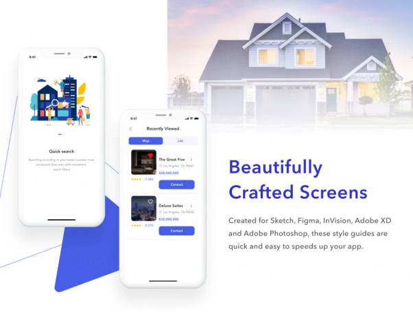 房地产App应用iOS UI套件,允许用户搜索并获取有关房地产的信息。他们可以根据自己的兴趣轻松自定义个人资料。用户可以通过定义位置或过滤功能(价格,房屋面积,房屋类型,房屋空间等)快速找到合适的房屋。