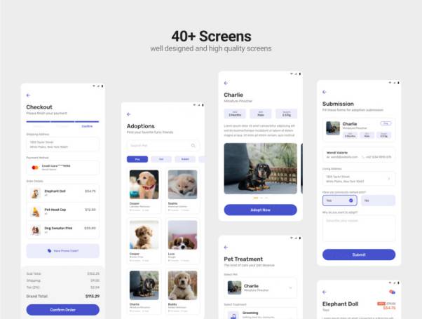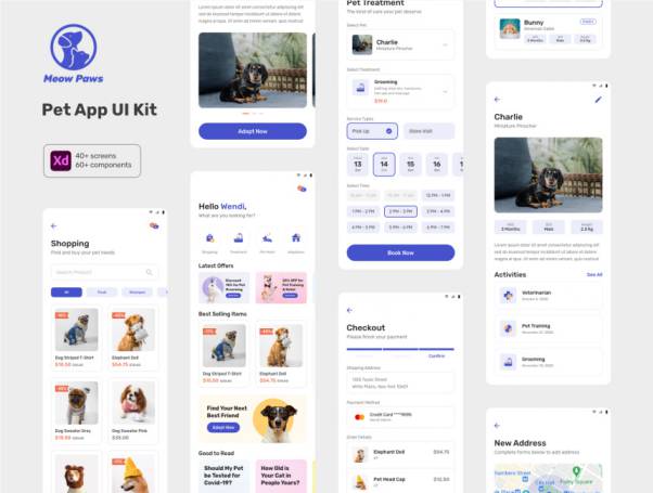 Meow Paws是Adobe XD的ui套件,涵盖了许多宠物企业。您可以用来创建宠物移动应用程序的多用途,例如宠物店,宠物美容,兽医,培训,宠物旅馆和宠物收养。它在分层和有组织的元素中包含40多个屏幕和60多个组件。
