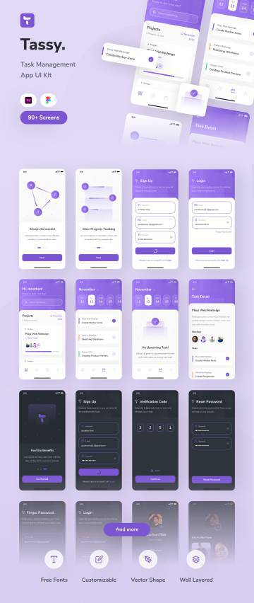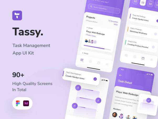 Tassy是一种任务管理应用程序UI套件,具有干净流畅的样式,总共包含90多种高质量屏幕,并具有可使用的iPhone X屏幕尺寸(375px X 812px)的iOS响应式调整大小功能,随时可以启动您的设计过程。