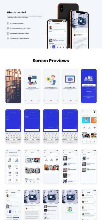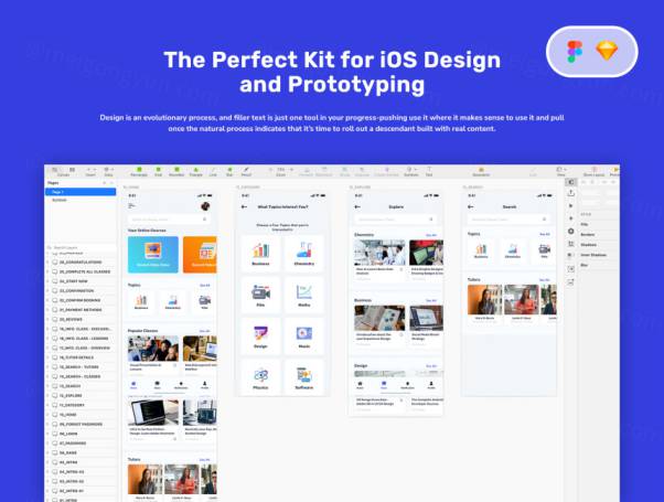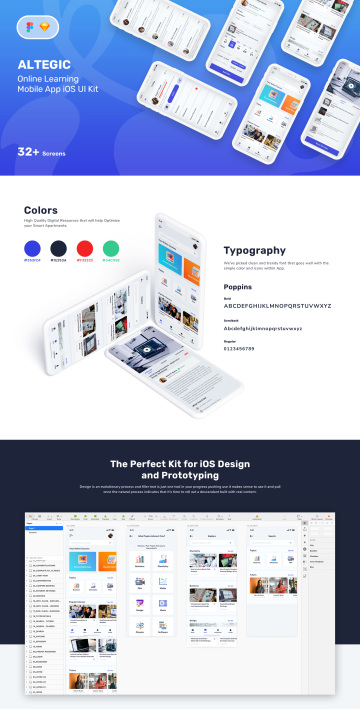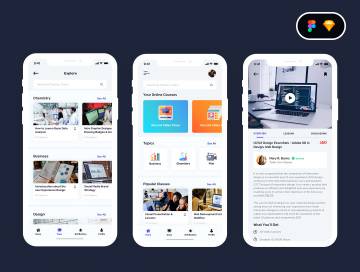 在线课程和电子学习移动应用UI套件。我们精心设计了与在线学习和电子学习服务移动应用程序服务相关的所有可能功能。它总共包含33个屏幕。每个屏幕都是完全可自定义的,易于使用,并且在Sketch和Figma中经过仔细地分层和组织。
