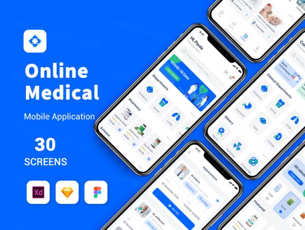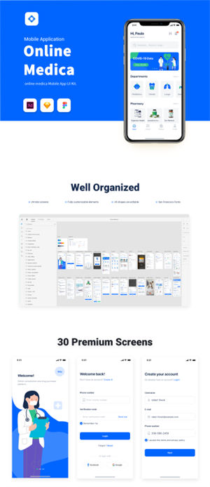 蓝色在线医疗移动应用程序。我们精心设计了与医院和医疗中心管理移动应用程序服务相关的所有可能功能。它总共包含30个屏幕。每个屏幕都是完全可自定义的,易于使用,并且在Sketch,Figma和Adobe XD中经过仔细地分层和组织。