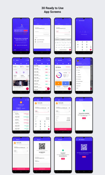 加密货币应用程序UI套件。基于Material准则和组件的简化的用户友好型加密货币钱包和交易应用程序。它带有30个设计独特且组织良好的“材料设计”屏幕集360x760px。组织良好且易于定制的Cryptocurrency App UI Kit可能是您下一个项目的绝佳解决方案。