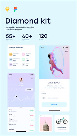 满足期待已久的多功能移动Diamond UI Kit的发布。它旨在通过超过55个精美的屏幕来加快您的创作过程。这是在Sketch和Figma中设计的直观的iOS样式指南,它是精心制作的。钻石套件的设计简单而引人注目。它分为11个真正需要的类别:通信,入职,成功与失败,订阅,评估应用程序,电子商务,旅行,登录,个人资料,日历,财务