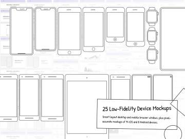 低保真桌面和移动浏览器窗口,以及14个iOS和8个Android设备的像素精确模型。