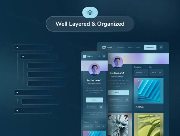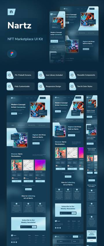 Nartz 是一个 NFT Marketplace 平台 UI 套件,具有干净的暗模式和时尚的风格,包含 70 多个预构建的屏幕,具有响应式设计的桌面、平板电脑和移动屏幕,随时可用并准备启动您的设计过程。