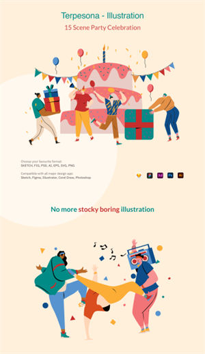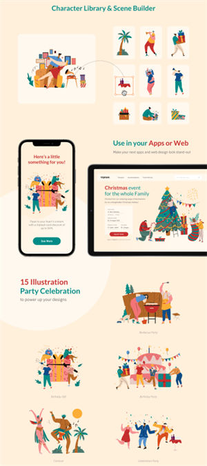 Terpesona Party & Celebration 插图包包括 15 个各种格式的预制场景插图,可随时成为您网站或应用程序的一部分。