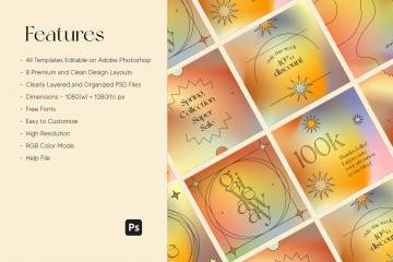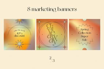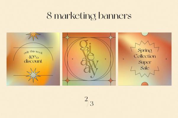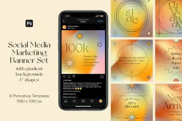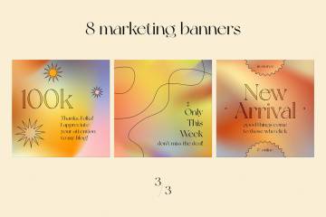 为您的 Instagram 或 Facebook 获取一组 8 个很酷的横幅。只需放置您的照片并编辑文本。这简单!酷炫的网格渐变、渐变背景、灯光效果、颗粒纹理。专为现代创作者打造。