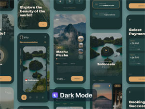 黑暗模式下 Nature Travel Expedia 的应用程序概念,此应用程序可帮助人们查找和预订周围或其他国家/地区的美丽自然之旅。