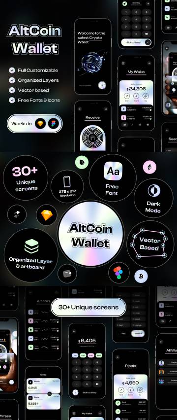 AltCoin Wallet - Crypto Wallet UI Kit 是一款来自中产阶级的新产品,是一款适用于 Figma 和 Sketch 的高质量原子 UI 设计套件。