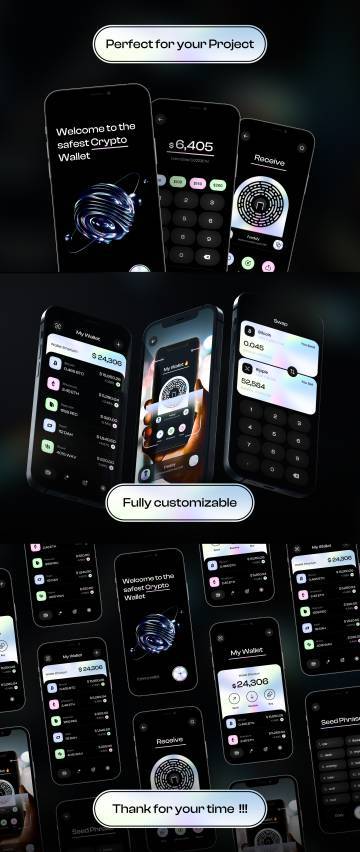 深色镀铬渐变比特币虚拟货币数字钱包移动APP界面UI素材 Crypto