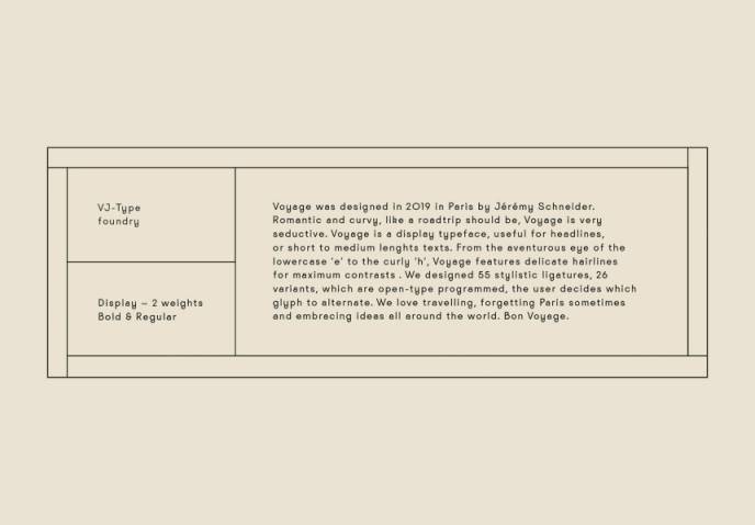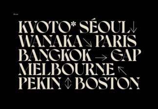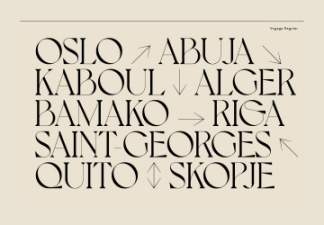 最后,Voyage 由两个字重(粗体和常规)和 55 个连字和 26 个变体组成,每个开放式都经过编程,以便用户可以决定要替换哪个字形,Voyage 是“拥抱世界各地的想法”的排版示例。Violaine 和 Jérémy 还希望这种字体能够以大尺寸使用,特别适合作为标题字体或短文本。他们建议说,也许它“在电影开场时会很漂亮,沿着它的曲线有漂亮的动画”。“让我们梦想大卫芬奇或萨姆门德斯的电影开场和海报。”
