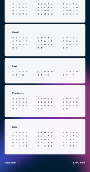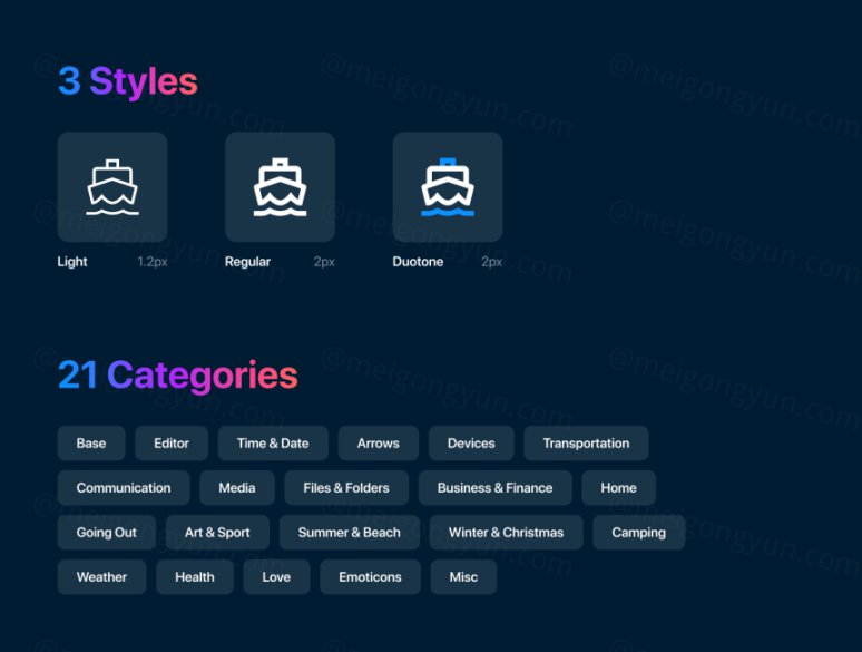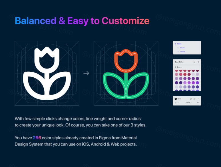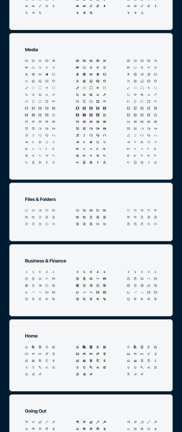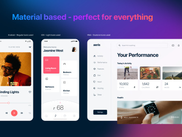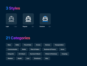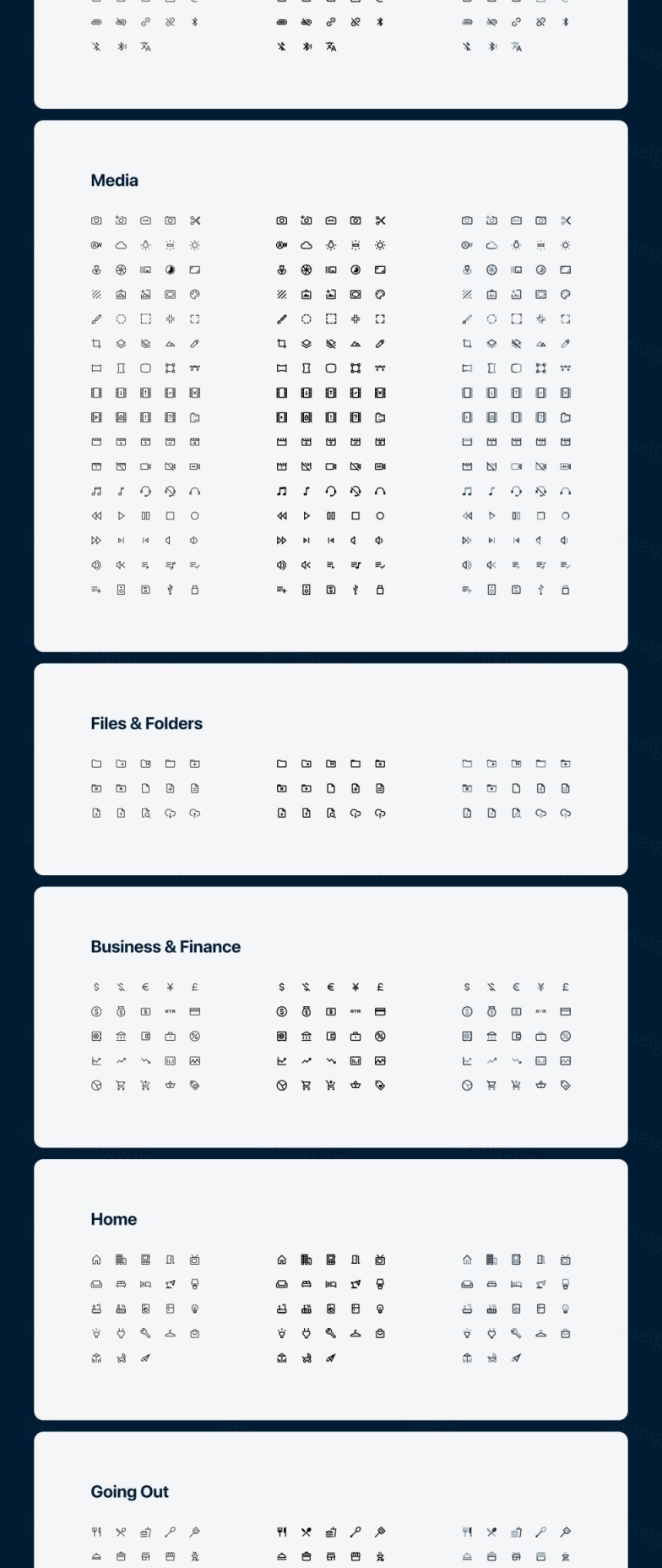 它们的形状源自Google的Material Design系统,并通过iOS更加流畅的外观进行了重塑,因此它们完美地融合了两种语言。您可以选择3种样式-浅色,常规和双色调。通过调整拐角半径,笔触粗细或颜色,可以根据您的项目方向自定义所有这些内容。我们推荐的工具是Figma
