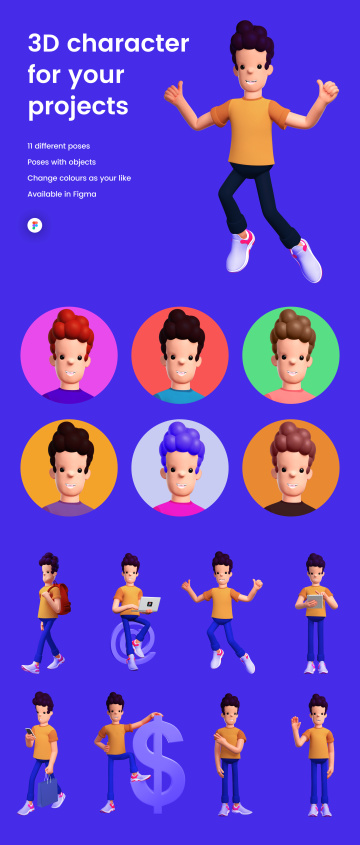 可爱的3D角色套件具有10个独特的姿势,可与您的项目配合使用,该套件可在Figma中使用,并可根据您的需要定制颜色。