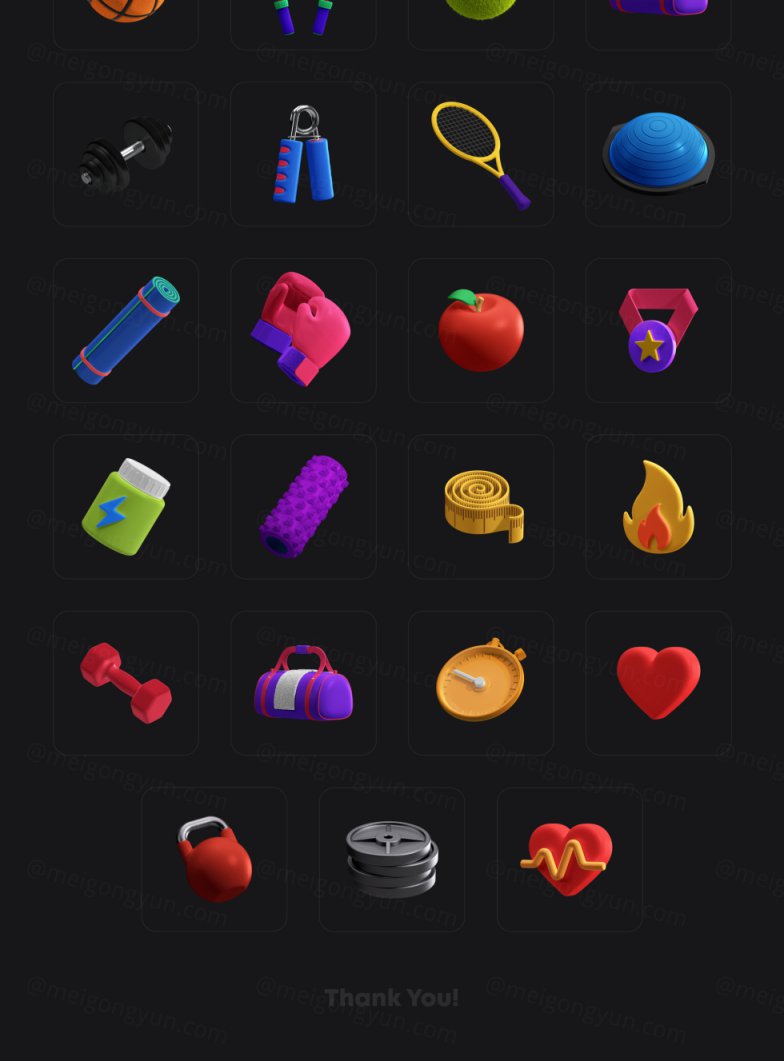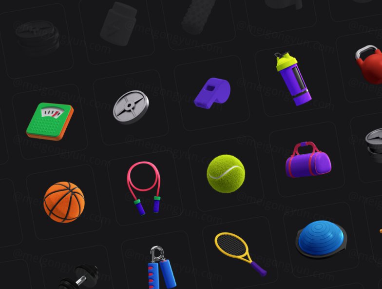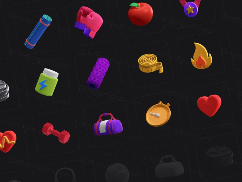 图穷联素材库 » 25个三维立体健身器材元素 3D Icons Pack - Fitne