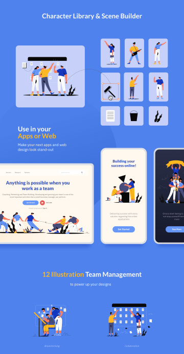 Inteam - 团队管理插图集包括 12 个各种格式的预制场景插图,可以成为您网站或应用程序的一部分。
