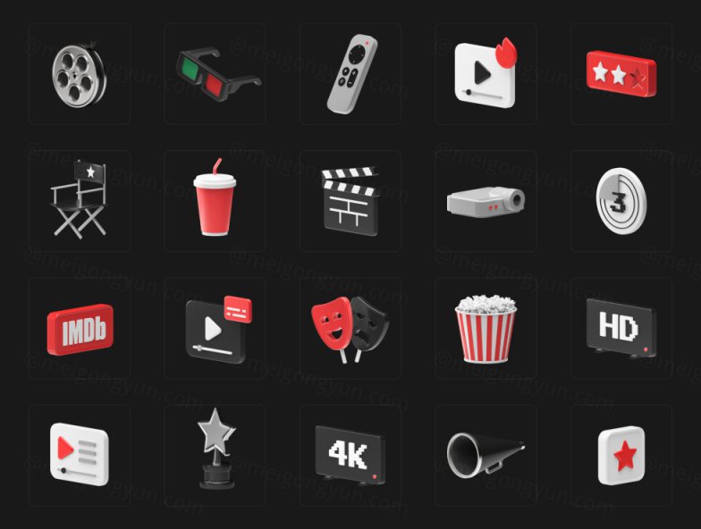 图穷联素材库 » 高品质C4D三维渲染影院主题元素图标合辑 Cinema 3D Icon