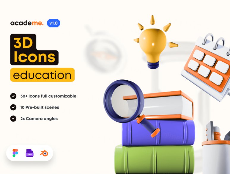 Figma 和 Blender 格式的 30 个可定制的教育 3D 图标。非常适合应用程序、网站、演示文稿等!