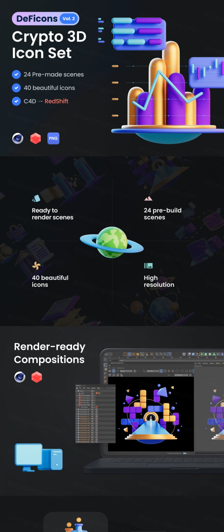 向 DeFicons 打个招呼 - 3D Icon 一组美观的加密场景,完全可定制并准备好在 C4D 中渲染(使用 RedShift)。
