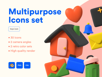 这个包包括准备渲染 2 个具有 30 个独特图标和 2 个摄像机视角的 Blender 场景和 120 个可用于您的项目的预制 PNG 场景。