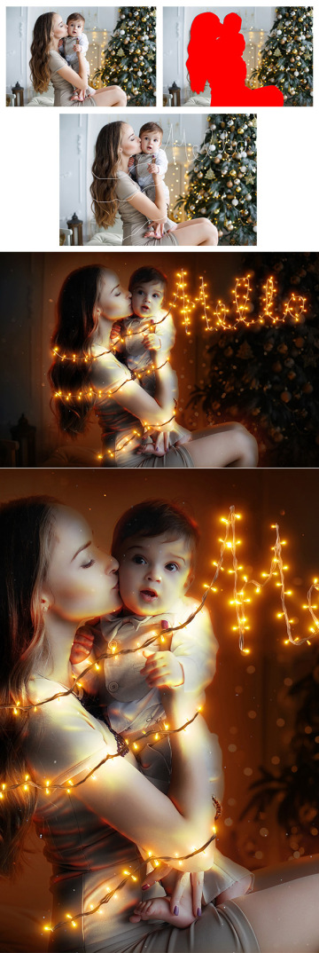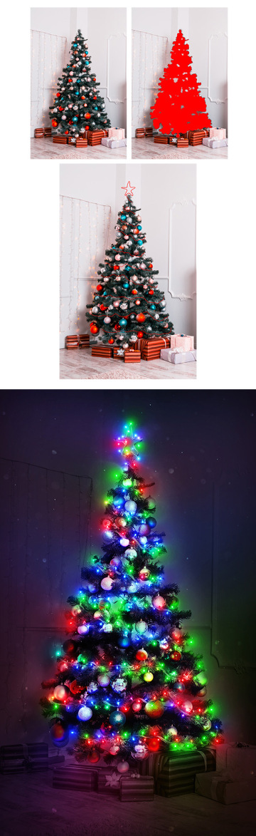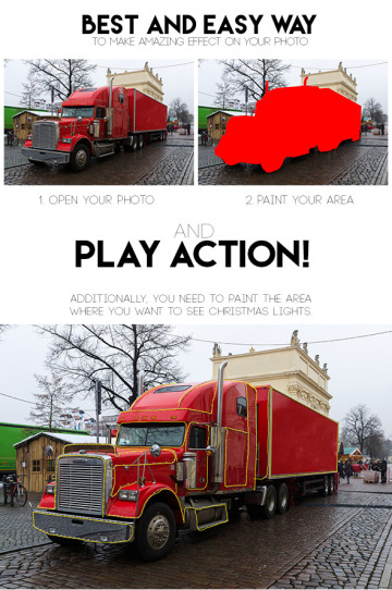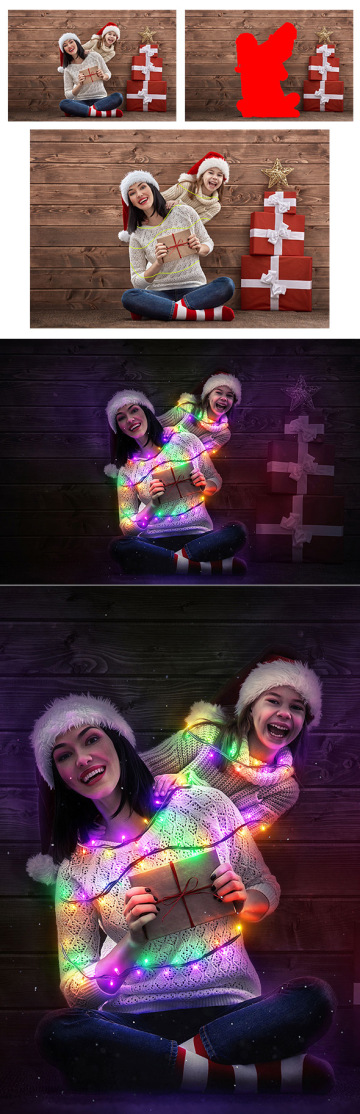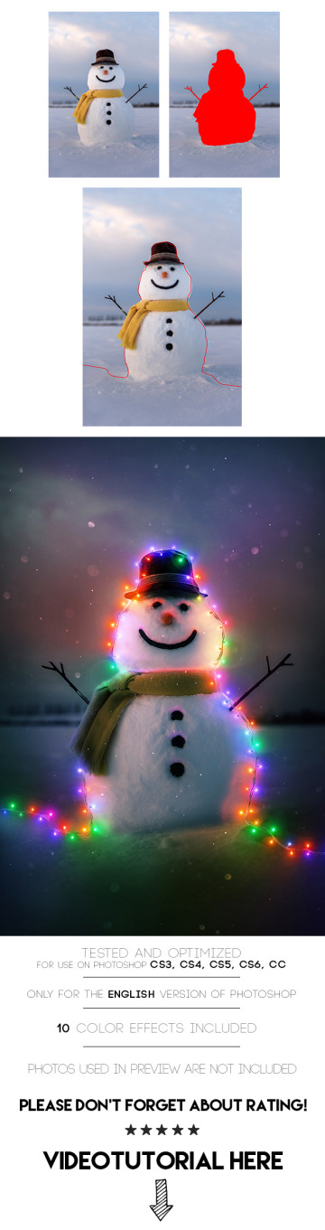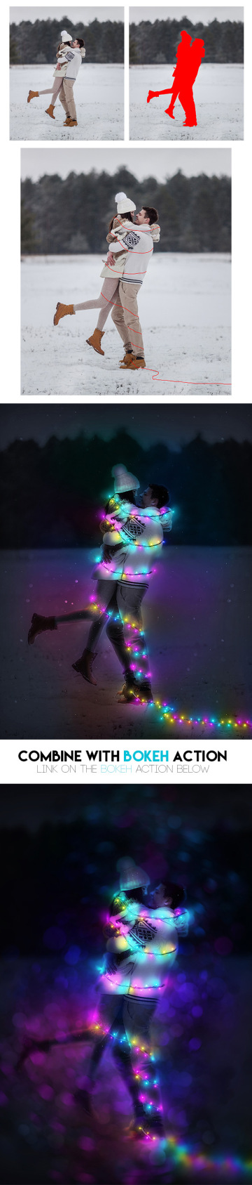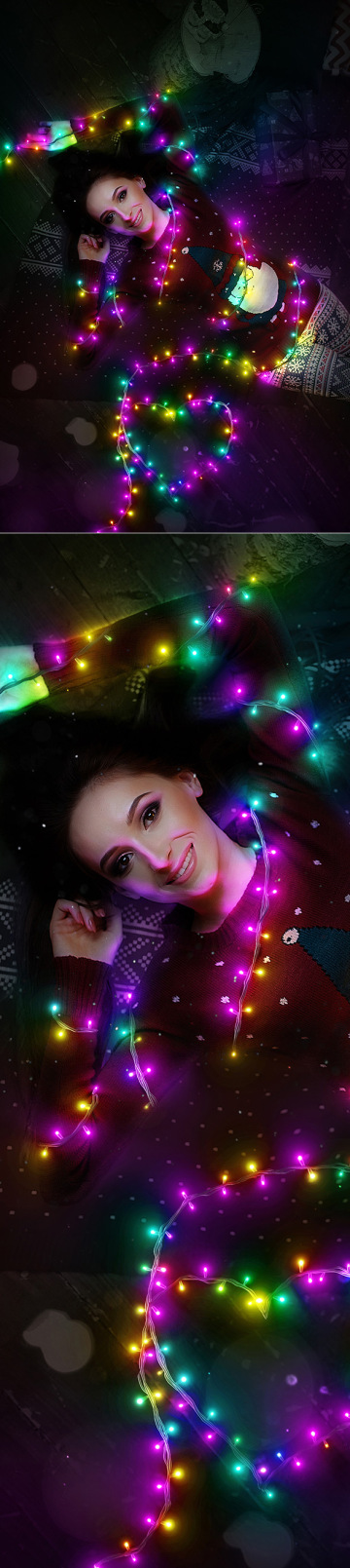Christmas Lights Action adds to your photo realistic Christmas lights effect. You can change the colors of lights and make a one color light effect. Action contains 10 color FX. Save hours of work with this action. After action finish the work you get a well-organized and structured file with the many layers, folders and settings to improve the final result. Action perfectly work on Mac and PC.
