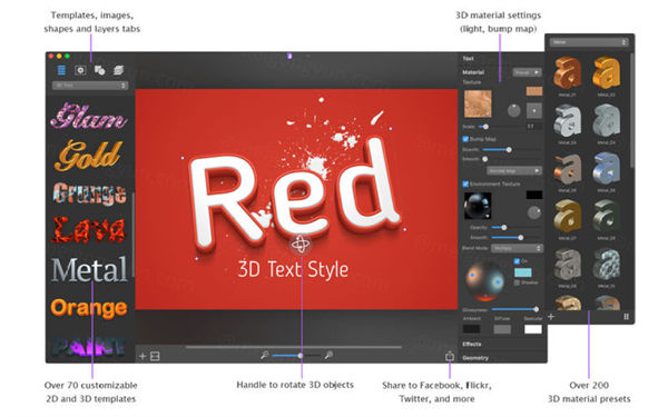 专业设计师和业余爱好者将通过创建逼真的3D文字等任何天然材料--木材,生锈,打破玻璃复杂的效果异常轻松惊奇,甚至巧克力,软阴影和光晕,图形画的油或水彩画,年龄和庸俗的名称,以及更多。