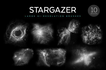 太空星云笔刷 Stargazer Photoshop Brush Set 充满占卜味道,共10种不同风格的笔刷,帮助你快速设计出不同的星云、星系特效。