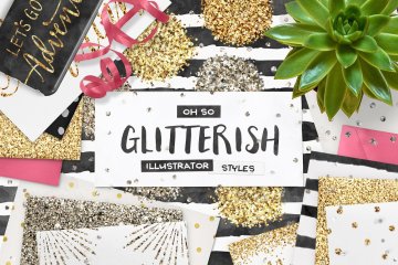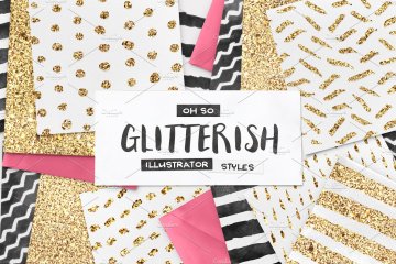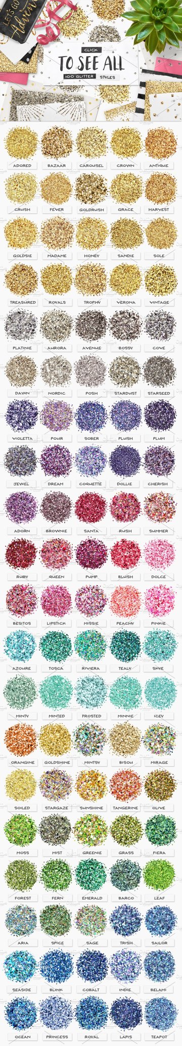 GLITTER STYLES - 这套设计充满了100款迷人而独特的高分辨率闪光款式,适合Illustrator-- 只需点击一下,你就会噢,所以GLITZY&READY GO! 你可以选择黄金,银色,粉红色,蓝色,薄荷糖...,不要忘记每种风格都是独一无二的 - 你可以很快创建自己的华丽色彩和另外100种款式(最少)!多么酷啊?请注意,闪光风格/色板是光栅不是矢量。