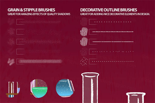 CHEMIST Illustrator和Photoshop笔刷套装。 在这个集合中,您将获得散射着色器画笔,纹理和清晰的线条画笔,纹理和点画笔,Illustrator的装饰性轮廓画笔,以及作为奖励,Photoshop的复古纹理画笔!你会喜欢在Illustrator和Photoshop中使用这些画笔在任何类型的项目中,从复古,grunge风格的插图