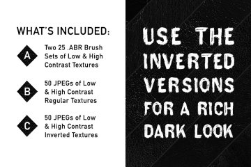 该套装包含所有25种纹理的高对比度和低对比度版本,因此产品中包含以下资产:2个版本的.ABR Photoshop笔刷包(每个包含25个刷子,每个都在Adobe CC中制作),2包常规(光)黑白JPEG(总共50张)和2包倒置(深色)黑白JPEG(总共50张)。JPEG均为300 DPI,大小为1900像素×1300像素。