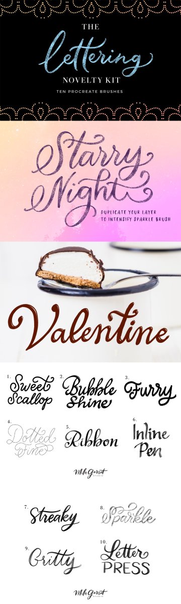 Procreate的Lettering Novelty Kit有十个有趣和古怪的笔刷用于刻字 - 继续,创建一些闪闪发光的字母或泡泡字母!