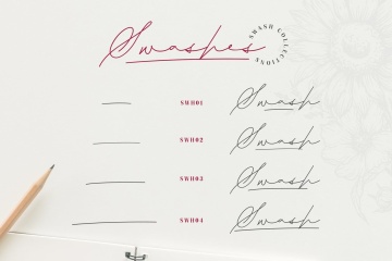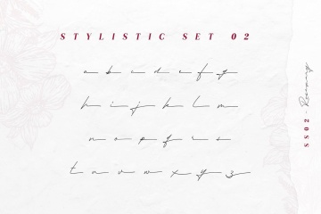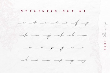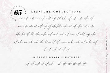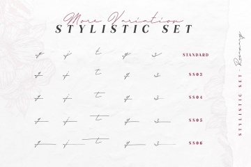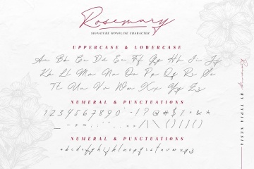 Rosemary 签名字体带有大小写标准字符、标点符号、数字。以及 OpenType 功能的其他 Glyphs 变体,例如标准连字、样式替代和样式集。