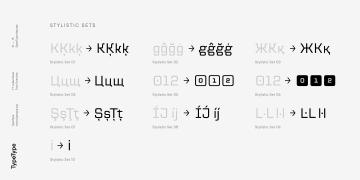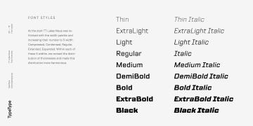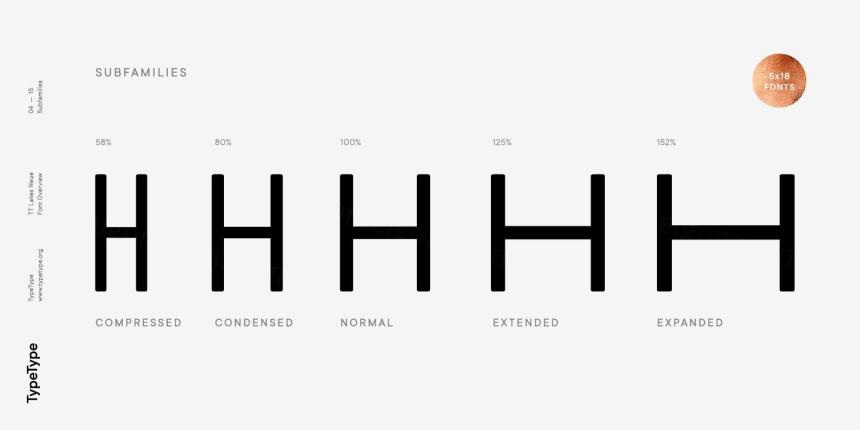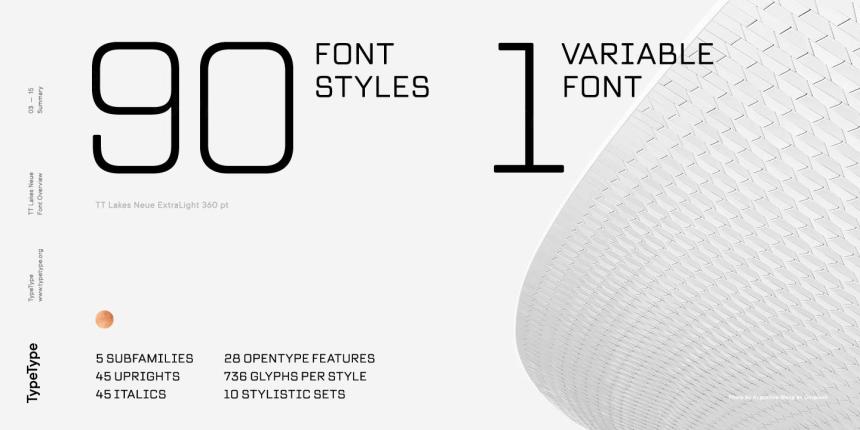 TT Lakes Neue 包括 5 个子系列:压缩、浓缩、常规、扩展、扩展。每个子族由 9 个直立和 9 个斜体组成,总共有令人难以置信的 90 个面 + 1 个可变字体 + 2 个轮廓样式。与其前身不同,新 TT Lakes Neue 的每种样式都包含 736 个字形和 28 个 OpenType 功能。TT Lakes Neue 具有样式交替和连字、旧式数字、斜线零、两组圆圈中的数字、箭头和其他有用的功能,例如 aalt、ccmp。locl, subs, sinf, sups, numr, dnom, frac, ordn, lnum, onum, case, dlig, liga, calt, salt, zero, ss01, ss02, ss03, ss04, ss05, ss06, ss08, ss07, ss0 ss10。