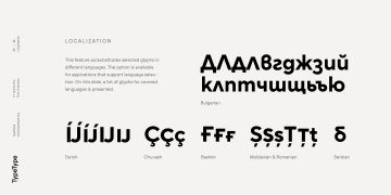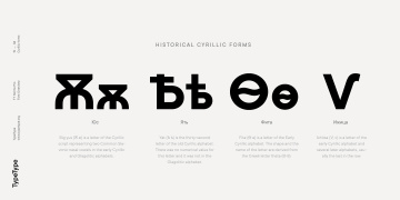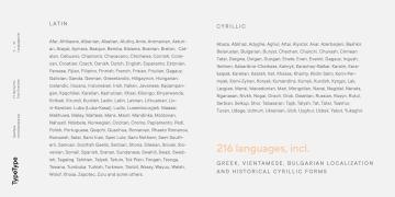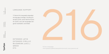 现在我们将更多地讨论 TT Norms Pro 中的角色集以及影响其发展的因素。首先是语言支持——TT规范中出现了100多种新语言,现在支持的语言总数超过260种。除了扩展的拉丁语和扩展的西里尔语外,希腊语终于出现在字体中。对于某些语言,例如保加利亚语,我们准备了某些字符形式的本地化版本。作为奖励,我们绘制了几个历史西里尔字符。
