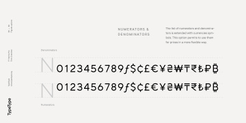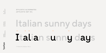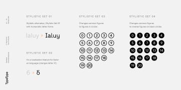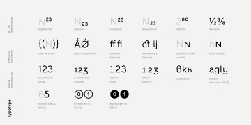 TT Norms Pro OpenType 功能列表: ordn、case、locl、c2sc、ccmp、smcp、frac、sinf、sups、numr、dnom、rnum、onum、lnum、pnum、ss01、ss02、ss03、ss04、ss06、ss07 , ss08, ss09, ss10, dlig, liga, calt, salt