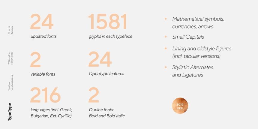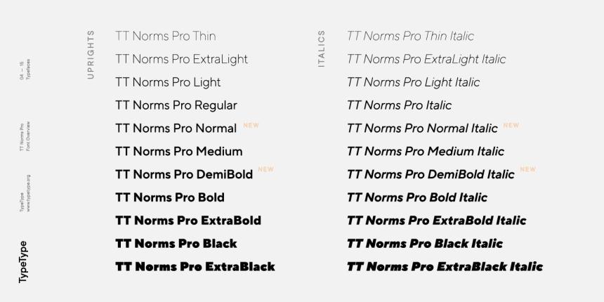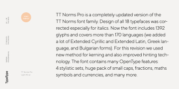 由于 TT Norms 是一个非常受欢迎的字体系列,因此我们不断收到为其添加新内容的请求,无论是支持其他语言、数学符号,还是小写字母。在某个时候,我们刚刚决定将所有这些愿望收集到一项技术任务中并引入一项重大更新,其结果是 TT Norms Pro。