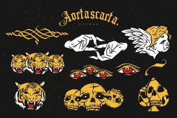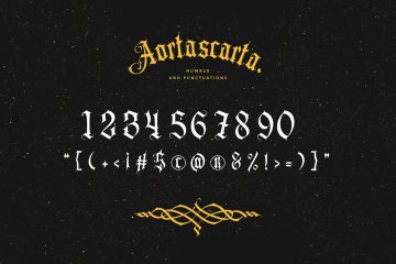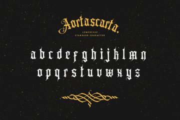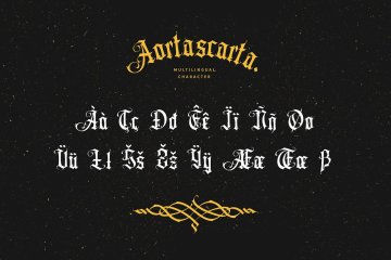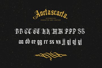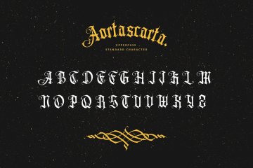 AORTASCARTA是一种带有轻微装饰感的 Old Blackletter 风格字体。和之前的 blackletter 字体一样,它总是非常适合制作标志,尤其是纹身标志、纹身刻字、纹身图案、证书等等。