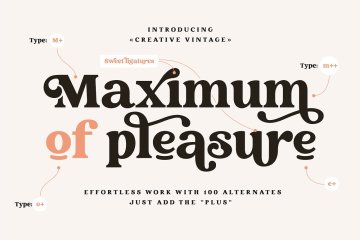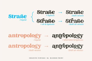 创意复古草稿:现代衬线,具有不完美的粗边和破旧的外观。这种字体严格复制了常规版本的所有内容,包括字形名称、字距调整和连字,因此您可以随时随地更改样式。当您在任何字母甚至连字后键入加号时,替代项会自动出现。
