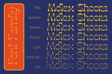 Molex Shoora 是一种受复古风格写作启发的字体。我们使每个元素都具有独特的风格,在顶部和底部边缘制作厚实,在中间开始变薄,这与每个字母一致