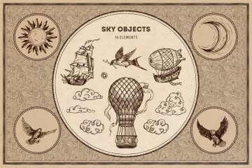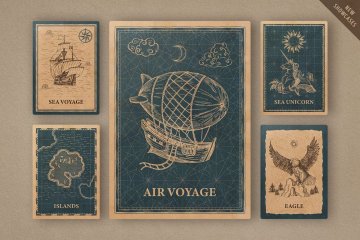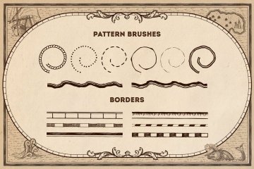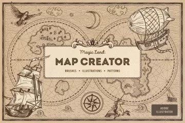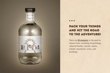 不要害怕计划长途旅行的每条路径。包中有65种元素可供选择,包括生物(鸟类和航海怪物),天体(太阳,月亮,星星,云朵),船只(船舶,热气球,飞艇),海浪,岛屿,山脉,树木和建筑物(城堡和磨坊)。完成放置对象后,请注意背景和边缘:我们提供了15个画笔和15种水,陆地,天空和地图集网格图案。哦,当然还有指南针,任何航行都离不开它。你在等什么?每秒钟都很重要,您最好充分利用它来创建品牌设计,包装,海报,广告,横幅或徽标。确保带动观众,并向每个人展示您的Magic Lands!