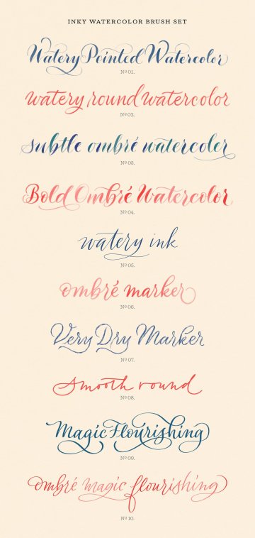 该画笔包包含5支水彩笔,3支记号笔,2支“魔术”画笔,以及 2支用于编辑您的刻字的红笔。所有这些都是我在自己的作品中使用的画笔,并且经过多年的改进,以实现我在不同项目中想要的墨迹效果。