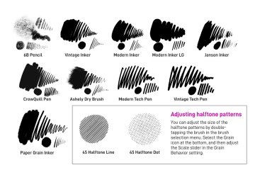 现在,Vintage Comic Ink Pack中的45个半色调点和半色调线条画笔表现为无缝画笔。您可以抬起铅笔,继续绘图时图案不会中断。请注意,只要不旋转画布,图案便会保持不变。