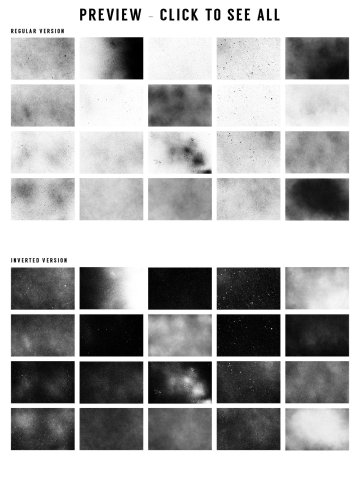 组由真实元素创建的20种黑白喷涂纹理。每种纹理也可以采用反向/负向版本。(因此,总共有40个纹理)。这些纹理非常适合为您的艺术品添加一些纹理,创建背景,为文本和对象添加垃圾效果(例如,当用作图层蒙版时)等。它们可以组合使用以获得自定义结果。我试图创建一个具有不同密度和成分的变化集-您可以在预览图片中查看该集中包含的所有纹理。